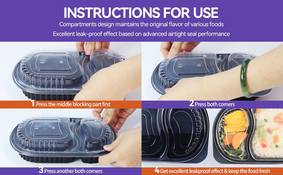 3.Cov thawv no yog BPA dawb, kub resistant thiab microwavable. Tsim los ntawm kev txhaj tshuaj molding, peb cov khoom muaj lub hau airtight kaw thiab ruaj ntseg khaws cov zaub mov. Durability thiab yooj, txo qhov tawg thiab tiv thaiv kev puas tsuaj ntawm cov khoom sib tw. Cov thawv yas nrog lub hau yog yooj yim los ntxuav. Eco-friendly thiab 100% recyclable.